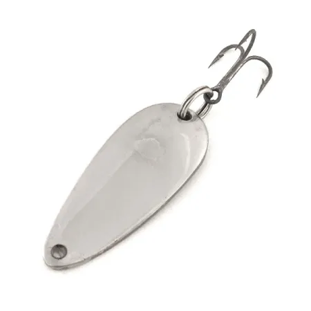 Iki veidrodinio spindesio nupoliruota šios klasikinės blizgės nikelio apdaila užtikrina puikų matomumą žvejojant skaidriame vandenyje. Tiksliai 3/16 oz (6 g) sverianti ši Eppinger Dardevle Midget išlieka pagrindiniu pasirinkimu lengvų įrankių entuziastams, vertinantiems JAV pagamintą furnitūrą. Kitoje pusėje yra ryškus, giliai įspaustas tekstas, identifikuojantis gaminį kaip autentišką „DARDEVLE MIDGET U.S.A.“, kas liudija apie meistriškumą iš Dearborn gamyklos Mičigane. 1 1/2" (3,5 cm) ilgio, išskirtinis pailgas ir įgaubtas profilis sukurtas specialiai spiningavimui, kai reikalingas svirduliuojantis žaismas. Šio egzemplioriaus furnitūra yra puikiai išsilaikiusi, su tvirtu žiedeliu ir aštriu trišakiu kabliuku, turinčiu itin mažai senėjimo žymių. Būklė vertinama 5/5, blizgė atrodo beveik nenaudota. Registruota prekės kodu 12825, masalas išlaiko lygius kraštus ir tikslų štampavimą, būdingą firminėms Eppinger formoms, naudojamoms bendrovės jau daugiau nei šimtmetį.