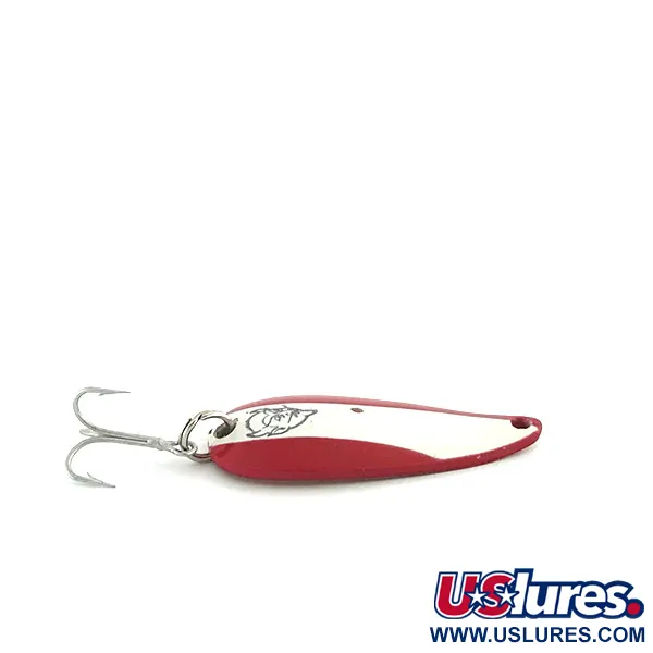 Poliruotas varis kitoje pusėje leidžia šią Dardevle Midget iškart atpažinti kaip universalią Eppinger klasiką. Ši 1 3/4" (4,5 cm) ilgio ir 3/16 oz (6 g) svorio blinkė pasižymi legendiniu raudonai ir baltai dryžuotu raštu priekinėje dalyje bei išskirtiniu velnio galvos logotipu. Ant varinės nugarėlės aiškiai įspausti žodžiai „DARDEVLE SPINNING U.S.A.“ – tai jos amerikietiškos kilmės ženklas. Šis egzempliorius, pažymėtas prekės kodu 8942, yra puikios 5/5 būklės, rodantis tik minimalius senėjimo požymius, tačiau išlaikęs ryškius dažus ir blizgią metalo apdailą. Jame sumontuotas švarus trišakis kabliukas ir tvirtas žiedelis. Šis dydis tradiciškai mėgstamas žvejojant upėtakius, ešerius ar mažaburnius ešerius lengvais spiningo įrankiais. Varinė nugarėlė sukuria subtilų, šiltą žybtelėjimą, kuris efektyviai kontrastuoja su ryškiomis priekinės dalies spalvomis.