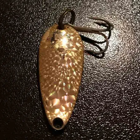 Kaltas „Crystal“ paviršius apibūdina šios Eppinger Dardevle Midget blizgės išvaizdą, atspindėdamas šviesą įvairiais kampais nuo faktūrinio paviršiaus. Sverdama 3/16 oz (6 g) ir būdama 1 1/2" (3,5 cm) ilgio, ši blizgė yra klasikinė pasirinktis upėtakių ar ešerinių žuvų žūklei lengvais įrankiais. Vidinėje blizgės pusėje aiškiai matomas įspaustas užrašas „DARDEVLE MIDGET“ – tai Eppinger prekės ženklo, veikiančio Mičigane nuo tada, kai 1906 m. Lou Eppinger įkūrė įmonę, kokybės ženklas. Šis konkretus masalas, žymimas prekės kodu 11800, yra 4/5 būklės. Žalvario atspalvio metalinis korpusas pasižymi būdinga įgaubta forma, užtikrinančia specifinį jos žaismą vandens sluoksnyje. Trišakis kabliukas pritvirtintas tvirtu žiedeliu viršuje. Nors 1959 m. Eppinger perkėlė gamybą iš Detroito į Dirborną, gamybos procese tebenaudojamos originalios formos, kad būtų išlaikyta specifinė šių JAV pagamintų blizgių geometrija. Iškilioje pusėje esantis „Crystal“ raštas skirtas skaidyti atspindžius, suteikiant kitokį blizgesio profilį, palyginti su standartiniais lygaus paviršiaus Dardevle variantais, randamais daugelyje senovinių žūklės dėžučių.