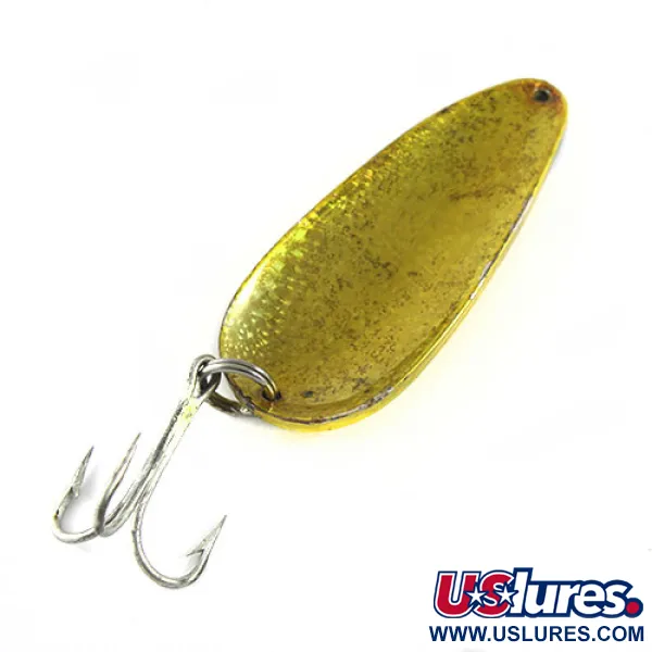 Kalto aukso tekstūros spindi šio vintažinio egzemplioriaus paviršiuje, pabrėždamos klasikinį Crystal Golden Crystal spalvų raštą. 7 cm (2 3/4") ilgio ir svarios 36 g (1 1/4 oz) masės ši Dardevle Rok't Devle yra sukurta tolimiems metimams ir gyliui pasiekti. Eppinger gamina šias blizges nuo 1906 metų, naudodami patentuotas formas ikoniniam įgaubtam profiliui sukurti, dėl kurio jos tapo nepakeičiama Mičigano žvejybos dėžučių dalimi ir net karinių išgyvenimo rinkinių elementu. Ši konkreti blizgė, pažymėta produkto kodu 0651, priekinėje dalyje turi išspaustą „ROK'T“ žymę. Metalinis paviršius rodo nedidelius laiko ženklus su keliomis tamsiomis dėmelėmis, tačiau išlaiko puikų blizgesį, atitinkantį 4/5 būklės įvertinimą. Joje sumontuotas didelis, originalus sidabro spalvos trišakis kablys, pritvirtintas tvirtu žiedeliu, o smailėjančiame gale yra viena anga valui tvirtinti.