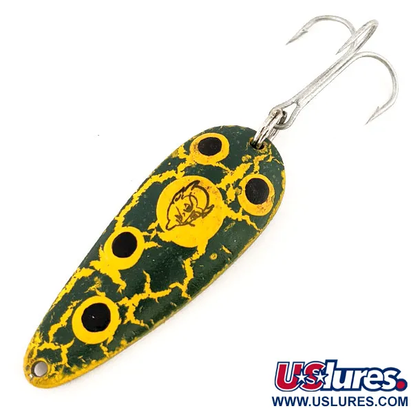 Žalia ir geltona „Frog“ suskilinėjusio paviršiaus apdaila pasižymi ši 7 cm (2 3/4") blizgė, turinti keturis geltonus žiedus su juodais viduriais, supančius centrinį geltoną diską. Šiame centriniame diske matomas kultinis „Eppinger“ velnio galvos logotipas – kokybės ženklas, kilęs iš bendrovės šaknų Detroite ir Dirborne, Mičigano valstijoje. Apvertus masalą, atsiveria švarus, poliruotas sidabrinis paviršius su įspaustais užrašais ROK'T-DEVLE, IMP ir U.S.A. Šis 21 g (3/4 oz) svorio egzempliorius skirtas spiningavimui įvairiomis sąlygomis, kai naudingas sunkesnis profilis. Masalas aprūpintas tvirtu trišakiu kabliuku, pritvirtintu per stiprų žiedelį uodegoje. Prekė yra 5/5 būklės, atrodo puikiai išlaikyta, su ryškiais dažais ir aiškiais įspaudais kitoje pusėje. Konkretus šio vintažinio gaminio kodas yra 12704.