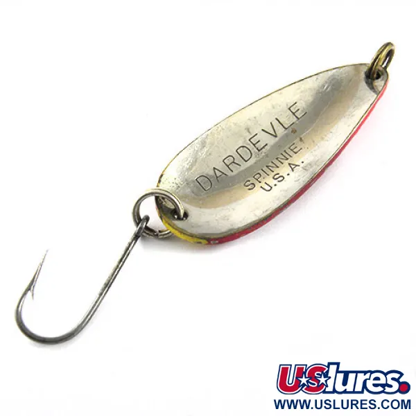 Ryškūs raudoni ir geltoni horizontalūs dryžiai puošia šios 4,5 cm (1 3/4") vartiklės profilį. Sverianti 9 g (1/3 oz), „Dardevle Spinnie“ (produkto kodas 0613) yra vienas mažesnių „Eppinger“ asortimento modelių. Šis masalas pagamintas JAV naudojant originalias įmonės formas, kurios sukuria giliai įgaubtą paviršių, būtiną specifiniam judėjimui vilkiuojant arba tolygiai traukiant. Ant geltonos juostos įspaustas klasikinis velnio galvos logotipas, turintis senėjimo žymių. Šio egzemplioriaus būklė vertinama 3/5 – matomi dažų nusitrynimai ir paviršiaus įbrėžimai atspindi jo istoriją žūklėje. Višakis kablys tvirtai pritvirtintas žiedeliu apačioje. Žalvario spalvos žiedelis taip pat yra viršutinėje dalyje, užtikrinantis patikimą jungtį naudojant lengvus įrankius. Ryškių pagrindinių spalvų kontrastas daro šį dažymą nepakeičiamu gaudant plėšrūnus įvairiomis apšvietimo sąlygomis.