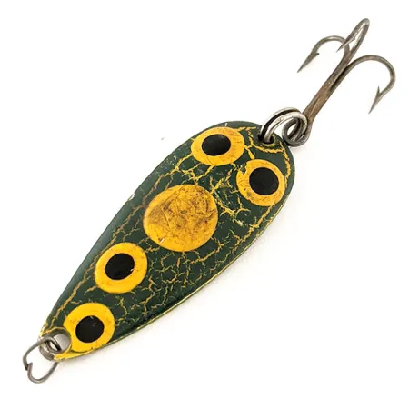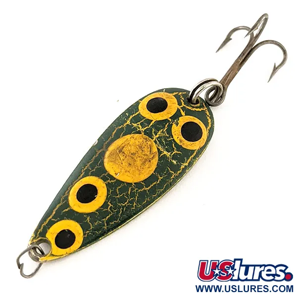Ryški žalia „crackle“ apdaila puošia šios 4,5 cm (1 3/4") blizgės paviršių populiariu „Frog“ raštu. Eppinger meistriškumas puikiai atsiskleidžia šiame Dardevle Spinnie modelyje, produkto kodas 12270. Šis modelis pasižymi išskirtiniu įgaubtu dizainu – tai prekės ženklo bruožas nuo tada, kai Lou Eppinger Detroite pradėjo rankomis gaminti masalus. Vizualinį patrauklumą sukuria dideli geltoni apskritimai juodais viduriais geltonų linijų tinkle sodriai žaliame fone. Apvertus masalą matoma švari, sidabrinio atspalvio nugarėlė su įspaudu „DARDEVLE SPINNE U.S.A.“, patvirtinančiu kilmę iš Dearborn, Mičigano. 9 g (1/3 oz) svoris suteikia pakankamą masę tokio dydžio masalui. Įrangą sudaro trišakis kablys ir žiedelis, abu su minimaliais nusidėvėjimo požymiais. Šis egzempliorius puikiai išsilaikęs, todėl vertas 5/5 būklės įvertinimo. Ryškios raidės nugarėlėje rodo tiesioginį ryšį su unikaliomis Eppinger gamyklos formomis.