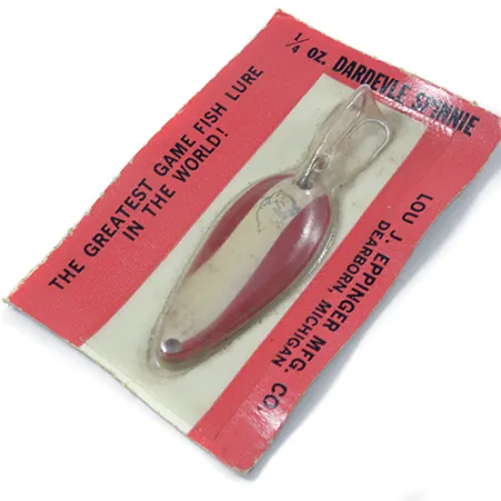 Sverianti 7 g (1/4 oz), ši klasikinė vartiklė pasižymi raudonai balta apdaila, kuri dešimtmečius reprezentuoja Eppinger prekės ženklą. Ši Dardevle Spinnie, žymima produkto kodu 2002, yra 4,5 cm (1 3/4 colio) ilgio ir išliko nenaudota originalioje Dearborn, Michigan pakuotėje. Blisteryje užsandarintas egzempliorius leidžia pamatyti originalią gamyklinę komplektaciją bei išskirtinį velnio galvos spaudą prie kilpelės valui. Metalinis korpusas suformuotas naudojant specialias formas, užtikrinančias metimams reikalingą balansą. Dearborn adresas ant pakuotės padeda priskirti šį masalą laikotarpiui po įmonės persikėlimo iš Detroito 1959 metais. Emalis išlieka ryškus ant pailgo metalinio paviršiaus, be jokių senėjimo ar sandėliavimo žymių.
