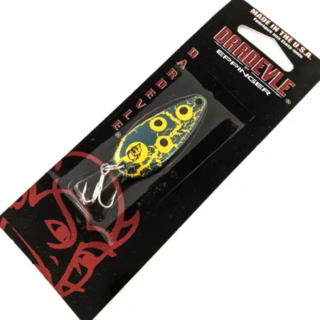Nikeliuota blizgės nugarėlė ryškiai kontrastuoja su priekinėje dalyje esančiu spalvingu „Frog“ raštu. Ši „Eppinger Dardevle Spinnie“, žymima kodu 24409, pasižymi geltonai juodu dėmėtu marginimu su keliomis geltonais apvadais apvestomis akutėmis. 4,5 cm ilgio masalas puikiai tinka įvairių žuvų žūklei – nuo ešerių iki upėtakių. 9 g svoris paskirstytas tradicinės formos vartiklės korpuse, komplektuojamame su sidabrinės spalvos trišakiu kabliuku ir tvirtinimo žiedeliu. Pagamintas JAV, šis egzempliorius yra nenaudotas ir parduodamas originalioje gamyklinėje pakuotėje. Juoda pakuotės kortelė papuošta klasikiu raudono velnio logotipu – istoriniu prekės ženklo iš Dirborno, Mičigano, ženklu.