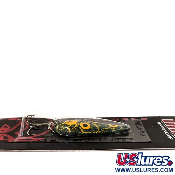 Geltonai žalias „crackle“ dažymas sukuria kontrastingą varlės raštą ant išgaubto šios blizgės paviršiaus. 9 g (1/3 oz) svorio ir 4,5 cm (1 3/4") ilgio Spinnie profilis yra kompaktiškas taikinys įvairiems plėšrūnams. Eppinger nugarėlę padengė variu, kuris suteikia šiltą metalinį blyksnį, besiskiriantį nuo standartinio nikeliavimo ar gildavimo. Šis masalas, kurio prekės kodas 24480, yra originalioje mažmeninėje pakuotėje ir niekada nebuvo naudotas. Priekinėje dalyje yra klasikinė štampuota velnio galvos emblema ir trys ryškūs geltoni taškai, būdingi šiai spalvinėms gamai. Skirta lengviems ir vidutinio lengvumo spiningo įrankiams, tai universalus pasirinkimas upėtakių, ešerių ar kitų plėšrūnų žūklei. Įvertintas 6 balais, masalas išlaiko gamyklinę išvaizdą be jokių dėvėjimosi ar aplinkos poveikio žymių.