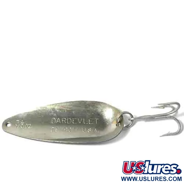 Ryški balta juosta driekiasi per šios 22 g (3/4 oz) blisgės centrą, įrėminta gilių juodų sekcijų, kurios sukuria aštrų vizualinį kontrastą. Centre aiškiai išmuštas kultinis velnio galvos logotipas, nurodantis, kad tai autentiškas „Eppinger“ kūrinys iš ilgos jų gamybos JAV istorijos. Ši „Dardevlet“ blisgė, kataloguojama prekės kodu 0026, yra 7 cm (2 3/4 colio) ilgio ir išlaikiusi originalią furnitūrą, įskaitant žiedelį ir trišakį kabliuką. Dažytas paviršius turi natūralių nusidėvėjimo žymių ir nedidelių dažų nutrynimų pakraščiuose bei prie kabliuko, todėl būklė vertinama 3/5. Šis konkretus spalvinis raštas buvo sukurtas matomumui įvairiomis vandens sąlygomis, todėl tai yra funkcionali Detroito žvejybos istorijos dalis.