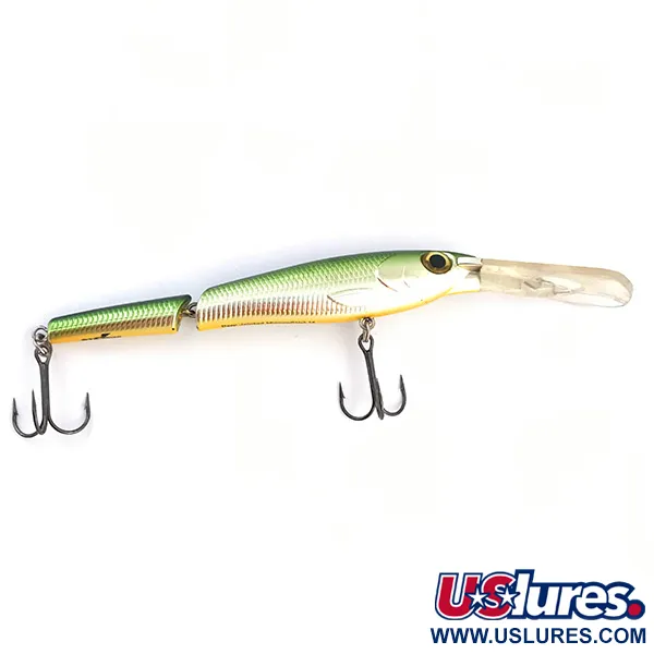 Ryškiai žalia nugara pereina į sidabrinių žvynų raštus šiame nariuotame vobleryje, kuris pasižymi ryškiai geltonu pilveliu ir įspaustu „STORM“ logotipu šalia galinio kabliuko laikiklio. Kataloge nurodytas kodas 4942, šis Deep Jointed Minnow Stick 14 yra 14 cm (5 1/2") ilgio ir sveria 25 g (1 oz). Dviejų dalių korpusas sujungtas su dideliu, skaidriu liežuvėliu, skirtu pasiekti iki 5,6 m (18,4 ft) gylį, nors metant jis paprastai dirba 1,5 m (5 ft) – 3 m (10 ft) diapazone. Konstrukciją sudaro du tvirti trišakiai kabliukai, pritvirtinti sustiprintais žiedeliais. Didelės auksinės akys su tamsiais vyzdžiais suteikia akcentą galvai, kurioje taip pat yra išlietos žiaunų detalės. Šis egzempliorius yra 5/5 būklės, išlaikęs švarią apdailą. Vidinė barškėjimo sistema sukuria triukšmingą akustinį profilį judant per vandens sluoksnius.