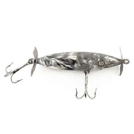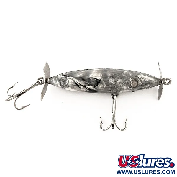 Marmuriniai pilki ir juodi tonai apibūdina šio vidurio amžiaus Amerikos klasikinio masalo apdailą. Kilęs iš JAV šeštajame dešimtmetyje, Diamond Rattler Jim Strader yra retas radinys paviršinių masalų kolekcionieriams. 8 g (1/4 oz) svorio grakštus kūnelis yra 7 cm (2 3/4") ilgio ir pasižymi išskirtiniu marmuriniu raštu, dengiančiu visą liemenį. Tiek priekyje, tiek gale sumontuoti metaliniai propeleriai, skirti sukurti paviršiaus suirutę tolygiai traukiant masalą. Konstrukciją sudaro du trišakiai kabliukai – vienas pilvo viduryje, kitas gale – visi puikiai išsilaikę. Subtili įleista akis suteikia galvos daliai tikroviškumo. Šis egzempliorius, atpažįstamas pagal prekės kodą 11552, yra švarus, o jo būklė vertinama 5/5.