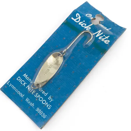 Ši „Dick Nite #1“ blizgė yra tiksliai 1 colio (2,5 cm) ilgio, pasižymi plonu metaliniu profiliu ir klasikiniu blizgaus nikelio paviršiumi. Pagaminta JAV, „Dick Nite Spoons“ gamykloje (produkto kodas 4939), ši blizgė atspindi tradicinę Lynnwood gamybos mokyklą. Sverianti vos 1/32 oz (1 g), ji skirta lengvam spiningavimui arba velkiavimui, kai reikalingas mažas masalo profilis. Blizgė yra nenaudota, vis dar pritvirtinta prie originalios mėlynos kartoninės pakuotės su „Original Dick Nite“ prekės ženklu. Masalo paviršius švarus ir gerai atspindintis šviesą, o galinėje kilpelėje įsegtas vienšakis kablys.