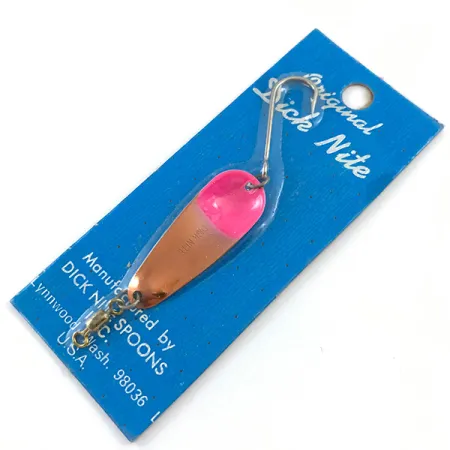 Vario atspalvio metalas ir ryškiai rožinis galiukas šioje vintažinėje blizgėje sukuria derinį, vertinamą dėl matomumo įvairiomis vandens sąlygomis. Dick Nite #2 sveria vos 1/16 oz (1,7 g), o jos ilgis – lygiai 1 1/2" (3,5 cm). Šis gaminys (produkto kodas 5316) yra nenaudotas, vis dar pritvirtintas prie originalios mėlynos „Original Dick Nite“ pakuotės kortelės. Pakuotė patvirtina jos kilmę – pagaminta „Dick Nite Spoons Inc.“ Lynnwood, Vašingtone, JAV. Masalo priekyje yra integruotas žalvario spalvos suktukas valui tvirtinti, o gale – aštrus vienšakis kabliukas. Vario apdaila išlieka ryški ir atspindinti šviesą, sudarydama kontrastą vientisai rožinei spalvai, dengiančiai viršutinį metalinio korpuso trečdalį. Šis modelis atspindi klasikinę Ramiojo vandenyno šiaurės vakarų žūklės įrankių dizaino erą, kurioje akcentuojama funkcionali furnitūra ir paprastas amerikietiškas meistriškumas.