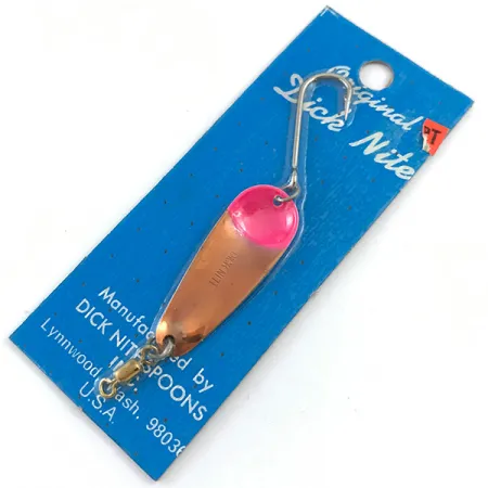 Ryškiai rausvas galiukas ant poliruoto varinio korpuso apibūdina šią vintažinę Dick Nite #2 blizgę, kuri vis dar pritvirtinta prie originalios mėlynos gamyklinės kortelės. 1,7 g (1/16 oz) svorio mažo profilio blizgė atspindi šiaurės vakarų žūklės įrankių gamybos paveldą iš Linvudo, Vašingtono. 3,5 cm (1 1/2") metalinis korpusas yra aiškiai pažymėtas gamintojo pavadinimu, o jo priekyje yra žalvario spalvos suktukas. Šis egzempliorius, pažymėtas prekės kodu 5318, yra nenaudotas, pasižymi švaria apdaila be jokių nusidėvėjimo žymių. Sidabrinio atspalvio kabliukas laikomas kortelės plastikiniame dėkle, taip išlaikant originalų surinkimą. Būklės įvertinimas – 6, nes masalas yra nenaudotas ir pateikiamas originalioje vintažinėje pakuotėje.