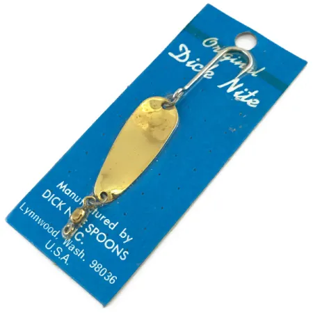 Auksuotas paviršius suteikia šiai Dick Nite #2 blizgei puikų matomumą; ji pagaminta Lynnwood, Wash. 98036, JAV. 1/16 oz (1,7 g) svoris ir 1 1/2" (3,5 cm) ilgis paverčia ją puikiu pasirinkimu lengvųjų įrankių entuziastams, žvejojantiems upėtakius ar Kokanee lašišas. Blizgė pasižymi plonu profiliu, sukurtu tiek velkiavimui, tiek spiningavimui. Šis masalas, kurio prekės kodas 8020, yra nenaudotas egzempliorius, vis dar pritvirtintas prie originalios mėlynos kortelės, o jo būklė vertinama 6 balais. Prie priekinės kilpos pritvirtintas suktukas padeda išvengti valo susisukimo, o gale sumontuotas tvirtas vienšakis kablys.