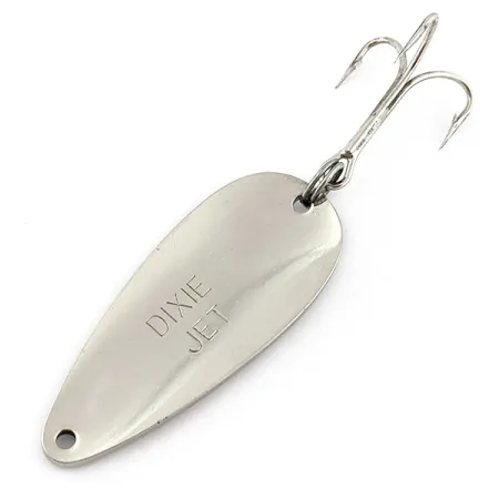 Ant poliruoto metalinio paviršiaus išgraviruotas „DIXIE JET“ užrašas žymi šią 18 g (2/3 uncijos) vartiklę kaip vintažinį „Dayton Bait Company“ gaminį. JAV pagamintas masalas pasižymi klasikine lašo formos forma, jo ilgis – 6 cm (2 1/4 colio), o paviršius dengtas blizgiu nikelio sluoksniu. Kolekcininkams šis modelis vertingas dėl tvirtos metalinės konstrukcijos ir itin gerai matomo atspindinčio paviršiaus. Masalas apginkluotas tvirtu trišakiu kabliuku, pritvirtintu žiedeliu gale, o siaurėjančioje priekinėje dalyje yra tiksliai išgręžta skylutė valui tvirtinti. Šis egzempliorius, pažymėtas prekės kodu 22880, yra 5/5 būklės, o visas jo korpusas pasižymi puikiu, švariu spindesiu.