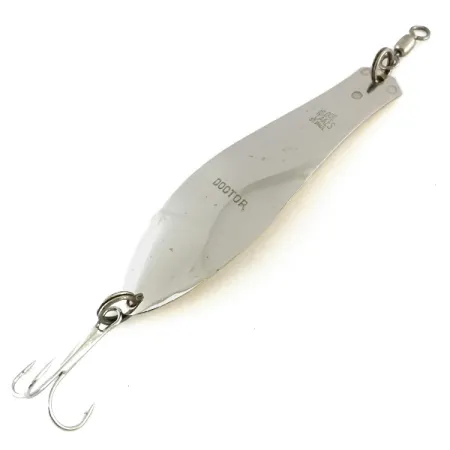 Ši 9,5 cm ilgio vartiklė, kurios metale įspaustas prekės pavadinimas „DOCTOR“ ir kilmės šalis „USA“, pasižymi didelio kontrasto dviejų tonų apdaila. Viena pusė padengta atspindinčiu nikeliu, o kita – poliruotu auksu, todėl priklausomai nuo šviesos kampo sukuriami skirtingi blyksnių profiliai. 17 g svorio vientiso metalo masė yra puikus pasirinkimas tiek spiningavimui, tiek velkiavimui. Įrangą sudaro statinės formos suktukas priekyje, skirtas valo susisukimui išvengti, ir stiprus trišakis kablys, pritvirtintas per žiedelį gale. Kalbant apie būklę, ji išlieka puikios 5/5 būsenos: paviršiai išlaikė pradinį blizgesį, o įspaudai yra ryškūs ir įskaitomi. Šis konkretus modelis, identifikuojamas pagal prekės kodą 8515, reprezentuoja klasikinį dizainą, kurį kartų kartos naudojo žvejodamos didelius gėlavandenius plėšrūnus.