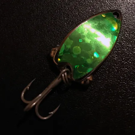 Žali holografiniai žvyneliai dengia viršutinę šio 3 cm (1 1/4") metalinio masalo dalį, užtikrindami puikiai matomą fluorescencinį blyksnį, reaguojantį į UV šviesą. JAV kompanijos „Fish Itt First Lure Co.“ pagamintas „Double Dancer“ pasižymi savitu pasunkintu profiliu, skirtu spiningavimui arba vertikaliam džigavimui. Poliruoto nikelio apdaila apatinėje dalyje kontrastuoja su ryškiai žaliu žvynelių raštu, sukurdama ryškų vizualinį efektą. Šis konkretus egzempliorius, pažymėtas prekės kodu 12500, išlaikė puikią išvaizdą, jo furnitūra ir apdaila yra puikios būklės (įvertinimas 5/5). 7 g (1/4 oz) masalo svoris sutelktas centre, tai užtikrina stabilumą ir metimo nuotolį. Valo tvirtinimo kilpa siauroje nosies dalyje ir trišakis kablys su žiedeliu uodegoje yra standartiniai šiam amerikietiškam dizainui, todėl tai puikiai išlaikytas radinys bet kuriam fluorescencinių „vintage“ masalų kolekcininkui.