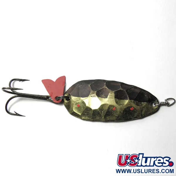 Ranka išmušti įdubimai žalvariniame korpuse apibūdina šios EGB vartiklės tekstūrą – tai skiriamasis amatininkų šveicarų gamybos ženklas. 1/3oz (9,5g) svorio ir 1 3/4" (4,5cm) ilgio metalas pasižymi dviejų tonų apdaila, išilgai padalinta į poliruotą žalvarį ir sodriai rudą dangą. Trys maži raudoni taškai išdėstyti žalvarinės pusės muštose briaunose papildomam kontrastui. Kitoje pusėje aiškiai matomas metalo paviršiuje išmuštas EGB logotipas ir „SWISS MADE“ tekstas. Širdelės formos raudonas plastikinis atraktorius sumontuotas ant galinio žiedelio, tiesiai virš trišakio kabliuko. Prekės kodas 0003, ši vartiklė vertinama 4/5 būkle, kas rodo jos laiką žvejybinėje dėžutėje, tačiau ji išlieka puikus kandidatas vintažinei kolekcijai. Žalvario medžiaga suteikia solidų svorį metimams į gilesnes vandens duobes.