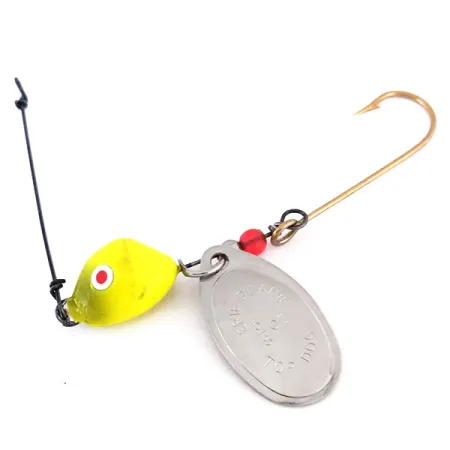 Nikeliuoti ovalūs lapeliai ir ryškiai geltona švininė galvutė išskiria šį Erie Dearie Top Dog – klasikinį radinį bet kuriam Didžiųjų ežerų žvejui. 1/2 oz (14 g) svorio, į priekį subalansuota konstrukcija pasižymi ryškiai geltonu dažymu su didelio kontrasto raudonai baltu taikinio akcentu. Sidabrinės apdailos lapelis aiškiai pažymėtas gamintojo ženklu, atskirtas nuo auksinio atspalvio kabliuko viena raudona viliojančia karoliuku ir tvirtu vieliniu rėmu. Pagamintas JAV, šis egzempliorius turi produkto kodą 10002 ir yra sukonstruotas ant ilgo kotelio kabliuko, skirto naudoti su gyvu masalu arba minkštaisiais masalais. Masalo fizinė būklė yra puiki (įvertinimas 5/5), originali apdaila ir furnitūra išliko išskirtinai švarios.