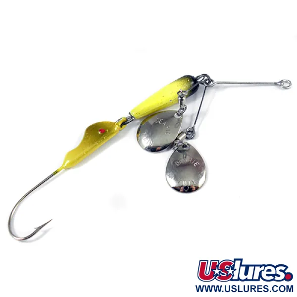 Ant nikelio lapelių aiškiai įspaustas žymėjimas „DEARIE TWIN“, nurodantis, kad tai specializuotas legendinės sunkinto priekio sukrės variantas. Ryškiai geltona švininė galvutė su tamsiai alyviniu akcentu priekyje užtikrina 1/2 oz (14 g) svorį, reikalingą dreifavimui ir metimui giliame vandenyje. Šiame konkrečiame modelyje (produkto kodas 2005) naudojamas vielinis rėmelis dviem poliruotiems nikelio lapeliams pritvirtinti vietoj tradicinio vieno, taip padidinant vizualinį profilį. Dažai išlieka sodrūs, o nikelio komponentai puikiai atspindi šviesą, todėl būklė vertinama 5/5. Sukurtas sudėtingai starkių žūklei Didžiuosiuose ežeruose, masalas turi tvirtą vienšakį kablys, integruotą tiesiai už pasunkinto korpuso. Įspaustos raidės ant abiejų lapelių yra ryškios ir lengvai įskaitomos, o tai atspindi amerikietiškos gamybos kokybės kontrolę.