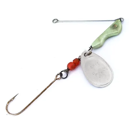Sunkio priekio (weight-forward) konstrukcija išskiria šią vintažinę Walleye Killer sukrę, turinčią štampuotą nikelio lapelį, patvirtinantį jos Erie Dearie kilmę. 2/5 oz (12 g) svorio masalas turi išskirtinį šviesiai žalią švininį korpusą, kuris suteikia reikiamą svorį metimams į gilesnes struktūras. Tarp lapelio ir ilgo koto vienšakio kabliuko du permatomi oranžiniai karoliukai sukuria subtilų vizualinį kontrastą metalinėms detalėms. Šis konkretus egzempliorius, pažymėtas prekės kodu 10430, yra puikios būklės (įvertinimas 5/5), išlaikęs ryškų nikelio komponentų blizgesį. Vielos rėmas yra tiesus, o žali dažai ant galvutės išlikę beveik nepažeisti, kas būdinga gerai išsaugotam Lake Erie žūklės istorijos pavyzdžiui.