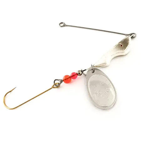 Šio sukto masalo (spinnerbait) ryškiai nikeliuota plokštelė su aiškiai įspaustu prekės ženklo pavadinimu yra pagrindinis vizualinis akcentas. 1/2 oz (14 g) svorio Erie Dearie Walleye Killer, atpažįstamas pagal produkto kodą 12120, yra klasikinis JAV pagamintos žūklės įrangos pavyzdys, sukurtas specialiai Didžiuosiuose ežeruose populiariai žvejybos technikai, kai svoris sutelktas priekyje. Konstrukciją sudaro balta ir sidabrinė žuvies formos galvutė, po kurios seka trijų karoliukų seka – du ryškių oranžinių ir raudonų tonų bei vienas mažas metalinis tarpiklis. Galinėje dalyje pritvirtintas vienas aštrus aukso spalvos kabliukas, paruoštas naktiniam sliekui užmauti, kaip įprasta šio tipo masalams. Vielos rėmelis yra tiesus ir gerai išlaikytas, užsibaigiantis tvarkinga kilpele tiesioginiam valo tvirtinimui. Šis pavyzdys yra 5/5 būklės, paviršiai švarūs, be jokių naudojimo žymių ant furnitūros ar nikelio apdailos.