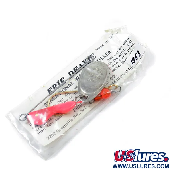 Nikelio danga ant didelio, štampuoto ovalaus lapelio sukuria pagrindinį blyksnį šiai JAV gamybos sukriukei. 1/3 oz (9 g) svorio Erie Dearie Walleye Killer yra sumontuota ant ilgo vielinio rėmo, kuris atskiria masalą nuo kabliuko smaigalio. Modelis pasižymi ryškiai rožiniu minkštu kūnu ir ryškių oranžinių karoliukų seka, kuri puikiai kontrastuoja su metalinėmis detalėmis. Šis masalas, žymimas prekės kodu 1953, tiekiamas originalioje skaidraus plastiko pakuotėje su gamykliniu įdėklu. Informacija ant kortelės nurodo kilmę iš Cortland, Ohajo valstijos, ir pateikia specifinius dreifinės žūklės būdus. Šis konkretus masalas yra nenaudotas, be jokių vielos ar minkšto plastiko nusidėvėjimo žymių. Gamintojo spaudas aiškiai matomas ant lapelio paviršiaus, pabrėžiant jo vietą Didžiųjų ežerų žvejybos įrankių pavelde.