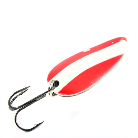Ši metalinė blizgė, kurios išgaubta pusė išmarginta klasikiniais raudonais ir baltais dryžiais, reprezentuoja nesenstantį „Glen Evans“ katalogo dizainą. Gamintojas, įsikūręs USA, įspaudė „EVANS“ pavadinimą įgaubtoje pusėje ant poliruoto nikelio paviršiaus. 2 1/2" (6,5 cm) ilgio ir 3/4 oz (21 g) svorio masalas turi pakankamai masės tolimiems metimams ar velčiavimui. Blizgė sukomplektuota su tvirtu trišakiu kabliuku, pritvirtintu per stiprų žiedelį gale. Bendra būklė yra tvirta 4/5, matomi tik nedideli naudojimo ženklai, išlaikytas dažų vientisumas ir metalo blizgesys. Šis modelis kataloguojamas produkto kodu 2907. Nikeliuota nugarėlė sukuria didelio kontrasto blyksnį prieš ryškius raudonus ir baltus dryžius viršutinėje pusėje.
