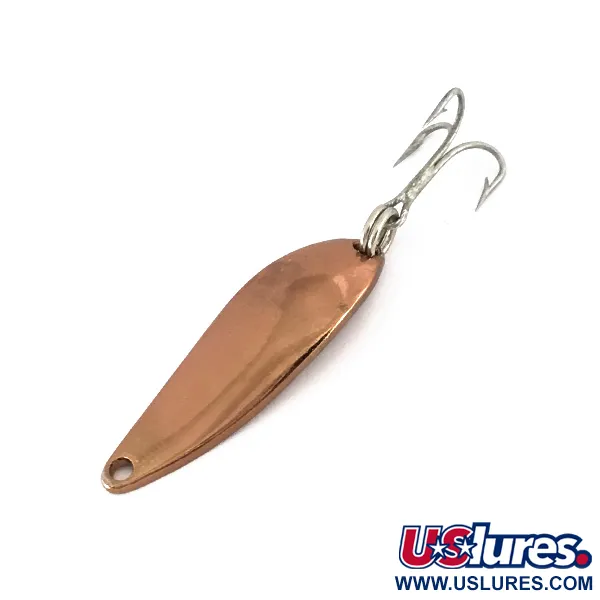 Šio JAV gamybos klasikinio masalo apdailoje vyrauja vario tonai – spalva, dažnai pasirenkama dėl matomumo drumstame vandenyje arba debesuotomis dienomis. Acme Fiord Spoon Jr, turintis 7787 produkto kodą, sveria vos 1/8 oz (3,4 g) ir yra specializuotas įrankis mėtymui arba vertikaliam džigavimui žvejojant atsargius plėšrūnus. 1 1/2" (3,5 cm) ilgio metalinis korpusas pasižymi išskirtiniu pailgu profiliu, kurį kolekcininkai atpažins kaip senovinį Acme dizainą, šiuo metu nebegaminamą. Apvertus masalą, įgaubtoje pusėje matomas „FIORD Jr.“ spaudas, tvarkingai įspaustas į varinį paviršių. Šis konkretus egzempliorius pasižymi puikiu 5/5 būklės įvertinimu, o metalinė apdaila ir furnitūra išlieka blizgios. Vienas žiedelis jungia aštrų trišakį kabliuką su uodega, o maža kilpelė valui tvirtinti ties smailėjančia nosimi yra visiškai švari.