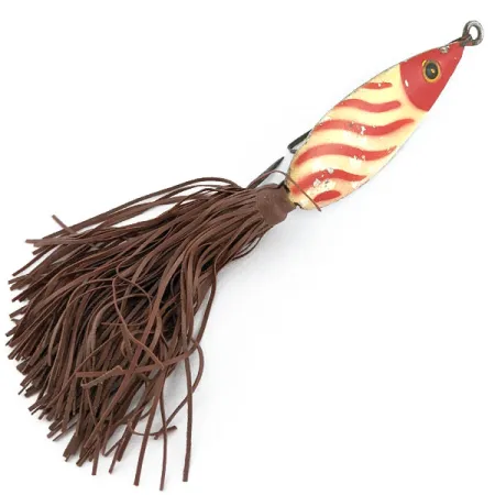 Šis 16 g (3/5 oz) masalas, pakankamai sunkus tiksliam užmetimui į augalijos tankmes, yra klasikinė Amerikos žūklės istorijos dalis iš Fred Arbogast dirbtuvių. Masalo apdaila pasižymi ryškiai raudona galvute ir korpusu, papuoštu ryškiomis, banguotomis raudonomis juostelėmis ant sidabrinio pagrindo. 6 cm (2 1/4 colio) ilgio masalas turi kultinį rudą guminį „sijonėlį“, kuris tapo Hula serijos simboliu ir buvo sukurtas išlikti elastingas net ir eksponuojant. Atpažįstamas pagal produkto kodą 22097, vartiklės tipo korpusas turi vieną į viršų nukreiptą, žolėms atsparų kabliuką – tokia konstrukcija specialiai skirta žvejybai tarp lelijų lapų ir tankios augalijos. Šis egzempliorius yra 4/5 būklės, turintis nežymių paviršiaus žymių, kurios pabrėžia jo autentišką vintažinę vertę, tačiau išlaiko ryškias originalias spalvas. Akis detaliai ištapyta su auksine rainele ir juodu vyzdžiu – tai išskirtinis JAV gamybos laikotarpio bruožas.