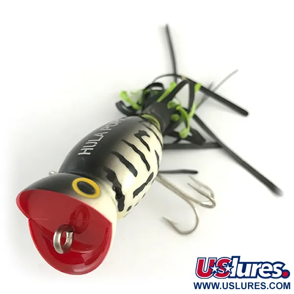 Šis egzempliorius pasižymi ryškiu „White Tiger“ raštu su drąsiais juodais dryžiais ant švaraus kreminio pagrindo. Šis 1/3 oz (10 g) svorio ir 2 colių (5 cm) ilgio Fred Arbogast Hula Popper masalas (produkto kodas 6617) turi ikonišką gilią raudoną įgaubtą burną, kuri tapo paviršinės žūklės standartu nuo tada, kai Arbogast pirmą kartą pristatė šį dizainą 1941 m. Originalią „Hula“ koncepciją čia reprezentuoja dviejų spalvų juodos ir laimo žalumo gumos sijonėlis, skirtas sukurti vizualinį patrauklumą net tada, kai masalas nejuda. Šis konkretus egzempliorius yra puikios būklės (vertinimas 5/5), su ryškiai geltonomis akimis, aiškiais juodais vyzdžiais ir gerai išsilaikiusiais sidabriniais trišakiais kabliukais. Ant viršutinės nugaros dalies aiškiai matomas įspaudas „HULA POPPER“, kontrastuojantis su pereinančia pilka ir balta apdaila. Didelio kontrasto tigro dryžių ir ryškiai raudonos burnos derinys paverčia šį masalą išskirtiniu egzemplioriumi bet kuriam kolekcininkui, besidominčiam vidurio amžiaus Arbogast masalais.