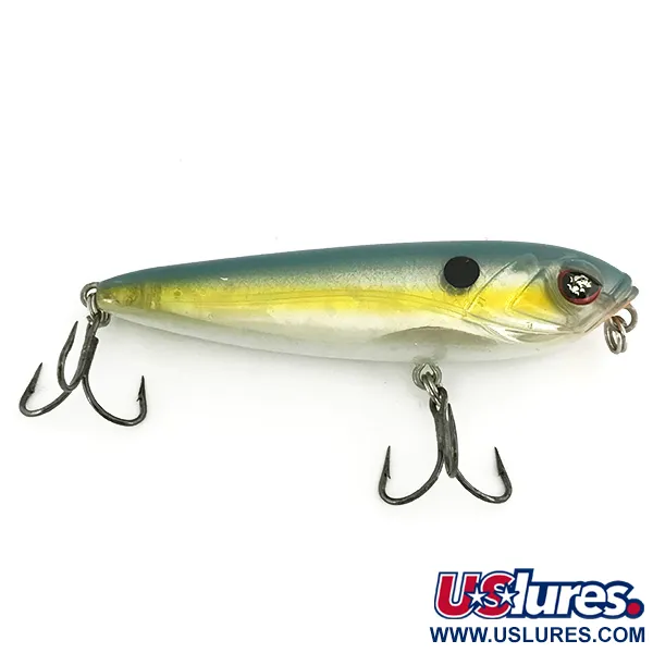 Ryški juoda šoninė dėmė žymi šio 10g (1/3oz) paviršinio masalo šoną, suteikdama aiškų taikinį paviršiniams kibimams. Šis Gary Yamamoto Tate' Pencil, atpažįstamas pagal produkto kodą 6960, pasižymi pereinamų spalvų gama: nuo sodrios melsvai žalios nugaros iki ryškiai geltonos juostos ir perlamutrinės pilvo dalies. 8cm (3 1/4") ilgio masalas turi tikroviškas raudonas 3D akis ir smulkios tekstūros žiaunų dangtelius, išlietus galvos dalyje. Šis JAV gamybos plūduriuojantis paviršinis masalas tinka tiek spiningavimui, tiek velkiavimui gaudant tokias žuvis kaip lašiša, lydeka ar starkis. Konstrukciją sudaro du tvirti trišakiai kabliukai, pritvirtinti ilgaamžiais žiedeliais. 5/5 būklės masalo danga išlieka ryški ir gyvybinga visame korpuse.