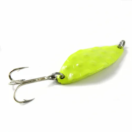 Ši 1/2 oz (14 g) blizgė, padengta ryškia Chartreuse spalva, išsiskiria tarp JAV pagamintų metalinių masalų. 2" (5 cm) ilgio Gibbs KOHO pasižymi savita kalinėta kūno tekstūra, skirta padidinti paviršiaus plotą ir atspindžius. Kitoje pusėje aiškiai įspaustas prekės ženklo antspaudas „GIBBS KO-HO“, patvirtinantis autentišką kilmę iš JAV. Šis egzempliorius, kurio produkto kodas 2813, yra puikios 4/5 būklės, o ryškūs dažai turi tik minimalių nusidėvėjimo žymių. Šiame modelyje naudojamas tvirtas trišakis kablys, pritvirtintas žiedeliu, todėl tai patikimas pasirinkimas tolimiems metimams ar velkiavimui. Lašo forma ir svorio paskirstymas užtikrina stabilumą ir atstumą gaudant lašišas ar upėtakius.