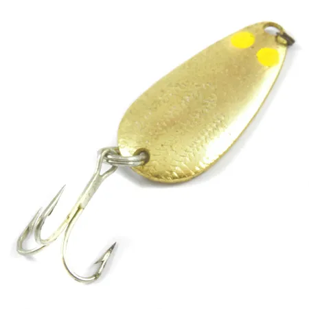 Paauksavimas ir tekstūrinė žvynelių apdaila apibūdina šios Glen Evans 576 blizgės vizualinį profilį. Du ryškūs geltoni taškai platesniame korpuso gale sukuria aštrų spalvų kontrastą metaliniame paviršiuje. Kitoje pusėje yra aiškus spaudas, identifikuojantis Glen Evans prekės ženklą ir modelio numerį 576, patvirtinantis jos amerikietišką kilmę. Šis egzempliorius yra 4 cm (1 1/2") ilgio ir sveria 5,5 g (3/16 oz), jo būklė vertinama 4/5, o paviršiai puikiai išlaikyti. Komplektacijoje yra originalūs žiedeliai valui tvirtinti ir trišakis kabliukas siaurajame gale, viskas sužymėta prekės kodu 3245.