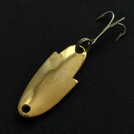 Ši 5,7 g (3/16 oz) svorio blizgė, pasižyminti sodriu auksiniu spindesiu, yra klasikinė „Glen Evans“ amerikietiškos žūklės istorijos dalis. Metalinis korpusas vidurinėje dalyje turi išskirtinį rantuotą profilį – dizaino elementą, būdingą „Evans '561'“ modeliui, kurio ilgis siekia 3,5 cm (1 1/2"). Apvertus masalą, įgaubtame paviršiuje matomas aiškus gamintojo įspaudas „EVANS '561'“, patvirtinantis autentiškumą ir kilmę iš JAV. Tvirtinimui naudojamas tvirtas žiedelis, laikantis bronzuotą trišakį kabliuką, o tiksli anga priekinėje dalyje skirta tiesioginiam valo rišimui arba segtukui. Šis egzempliorius, pažymėtas prekės kodu 20484, yra puikios 5/5 būklės – paviršius gerai išlaikytas ir ryškiai atspindi šviesą. Tai retas radinys tiems, kurie vertina paprastą, bet veiksmingą praėjusio amžiaus vidurio metalinių masalų geometriją.