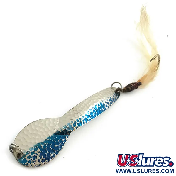 Kaltas priekinės dalies paviršius sukuria daugiakryptį blizgesį, kuris dera su ryškiu mėlynu žvynų raštu ant šios vintažinės Glen Evans Loco 5 vartiklės. 11 cm (4 1/4") ilgio, JAV pagaminta vartiklė pasižymi solidžiu 28 g (1 oz) svoriu, todėl yra stabilus pasirinkimas tiek spiningaujant, tiek velkiaujant. Vienšakis kablys papuoštas baltais šereliais, aprištais tamsiai raudonu ir juodu siūlu – tai klasikinė detalė, suteikianti masalui papildomą profilį ir judesį vandenyje. Kolekcionieriai atpažins ryškų lašo formos profilį, kuris siaurėja link viršutinio žiedo. Šis egzempliorius, pažymėtas prekės kodu 5549, skirtas žvejybai iki 1,0 m (3,3 ft) gylyje ir yra ypač vertinamas dėl savo efektyvumo viliojant neaktyvias lydekas stovinčiame vandenyje. Kaltas nikelis / mėlyna apdaila išlieka ryški, o bendra būklė vertinama 4/5. Kita pusė yra lygi, poliruota sidabrinė, kuri sukuria didelio kontrasto blyksnį prieš tekstūruotą priekį.