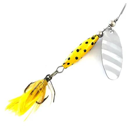 Ši sukrė, išsiskirianti ryškiai geltonu korpusu ir juodais taškais, yra Amerikos žvejybos istorijos dalis, sukurta originalaus gamintojo Glen Evans. 1/4 oz (7 g) svorio ir 2 3/4" (7 cm) bendro ilgio masalas turi poliruoto nikelio lapelį, ant kurio išspaustas „Shyster“ pavadinimas ir Glen Evans prekės ženklas. Šis konkretus gaminys (kodas 5382) yra puikios 5/5 būklės, su švariais dažais ir blizgančiomis detalėmis. Glen Evans pirmieji sukūrė šį dizainą JAV, vėliau jį perėmė kiti žinomi gamintojai, pavyzdžiui, Luhr Jensen. Sukrė sudaryta iš pasunkinto konuso formos korpuso ir trišakio kablio su geltonomis plunksnomis – toks derinys istoriškai naudotas lėtam traukimui tiek stovinčiame vandenyje, tiek upeliuose. Geltonos plunksnos išlieka tankios ir tvirtai pritvirtintos prie galinio trišakio.