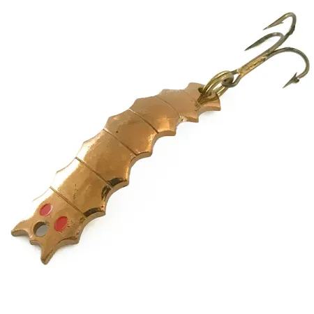 Segmentuoti variniai žvyneliai puošia šios unikalios lervos formos blizgės korpusą, pagamintą JAV. „Al's Goldfish Helgy“, prekės kodas 6650, pasižymi išlenktu profiliu, skirtu imituoti vandens vabzdžius. 4,5 cm (1 3/4") ilgio metalinis korpusas pasižymi giliais vario tonais, kuriuos pabrėžia du ryškūs raudoni taškai šalia tvirtinimo kilpos. 5,5 g (3/16 oz) svorio masalas yra puikus amerikietiškos žvejybos įrangos gamybos pavyzdys, pirmiausia skirtas spiningavimui upeliuose ar mažesniuose vandens telkiniuose. Furnitūra išlieka puikios būklės, naudojamas tvirtas žiedelis, jungiantis klasikinį bronzinį trišakį kabliuką. Šis masalas yra 5/5 būklės, jo briaunotas paviršius pasižymi ryškiu, tolygiu blizgesiu.