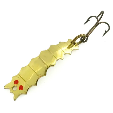 Segmentuota per visą ilgį, kad imituotų hellgrammite lervos formą, ši vintažinė žalvario atspalvio metalinė blizgė yra unikali Amerikos žūklės įrankių istorijos dalis. Al's Goldfish pagamino šią Goldfish Helgy, identifikuojamą pagal prekės kodą 7244, pasižyminčią išskirtiniu išlenktu ir įpjautu profiliu. 4,5 cm (1 3/4") ilgio masalas turi du rankomis nupieštus raudonus taškus ant galvos, kurie tarnauja kaip akys, esantys tiesiai virš priekinės kilpelės valui. Ant kūnelio nugarėlės aiškiai išspaustas užrašas „GOLDFISH HELGY“, išlaikant švarią tipografiją, būdingą prekės ženklo vidurio amžiaus gamybai JAV. Sverdama 4,5 g (3/16 oz), ši blizgė yra 5/5 būklės, pasižyminti ryškiu, atspindinčiu paviršiumi. Masalas apginkluotas vienu bronzos apdailos trišakiu kabliu, pritvirtintu per žiedelį uodegoje, paruoštas metimams srauniuose upeliuose ar tvenkiniuose.