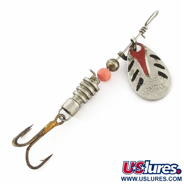 Ant sidabrinio „willow“ (karklo lapo) tipo lapelio aiškiai iškaltas „BIG BEND GYRO“ užrašas – tai šio reto vintažinio japoniško masalo skiriamasis ženklas. 5,5 cm ilgio ir subtilaus 2,5 g svorio masalas atspindi kruopštų praėjusio amžiaus vidurio Japonijos eksporto gaminių meistriškumą. Korpusas sudarytas iš rumbuotų metalinių segmentų, papildytas ryškiu oranžiniu karoliuku ir sidabrine sferine tarpine, leidžiančia lapeliui laisvai suktis ant vielinės ašies. Rankomis nupiešti juodi brūkšniai ir ryškus raudonas ševronas puošia lapelį, suteikdami vizualų kontrastą poliruotam metalui. Šis egzempliorius, pažymėtas prekės kodu 24391, turi originalų trišakį kabliuką ir yra išskirtinės 5/5 būklės – dažai bei metalinės dalys puikiai išsilaikiusios. Vielinė konstrukcija užbaigiama tradicine rankomis susukta kilpa, būdinga to laikotarpio lengvosios klasės sukrių konstrukcijai.