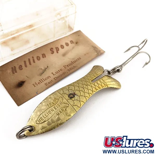 Tiesiogiai metale įspaustas „TRADE HELLION FISH MARK“ ženklas liudija, kad ši Mičigane pagaminta blizgė priklauso klasikinei „Hellion Lure Products“ erai iš Rytų Detroito. 7 cm (2 3/4") ilgio žalvario spalvos korpusas pasižymi giliai išgraviruotu žvynų raštu ir ryškiu žuvies formos siluetu. Šis nenaudotas egzempliorius, kurio būklė vertinama 6 balais, yra puikiai išsilaikęs, komplektuojamas su originaliu skaidraus plastiko dėklu ir „Hellion Spoon“ kartoniniu įdėklu. 12 g (2/5 oz) sverianti masalą papildo tvirtas žiedelis priekyje ir vienas trišakis kablys uodegos dalyje. Pažymėta prekės kodu 11770 ir „Crystal“ spalvos pavadinimu, metalo apdaila yra blizgi ir švari. Originali pakuotė nurodo kilmę iš Rytų Detroito, Mičigano valstijos, taip išsaugant regioninio Amerikos žūklės įrankių gamintojo istoriją.