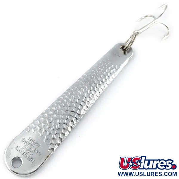 Ant šios 10 cm ilgio metalinės blizgės pagrindo esantis įspaudas aiškiai nurodo, kad tai „Herter's Cape Hatteras“ – pavadinimas, seniai siejamas su ištverminga žvejyba vidurio Atlanto pakrantėse. Sveriantis solidžius 42 g, šis masalas pasižymi išskirtine kalinėta sidabrinio atspalvio paviršiaus tekstūra, skirta sklaidyti šviesą įvairiomis kryptimis. Šis konkretus S2 modelis pažymėtas „Japan“ ženklu, atspindinčiu laikotarpį, kai „Herter’s“ užsakydavo tvirtą įrangą iš užsienio, kad išlaikytų savo garsiuosius aukštos kokybės ir kainos santykio standartus. Chromuota danga išliko puikios būklės, o veidrodinis spindesys vertinamas 5/5 balais. Galvutėje esanti plati anga paruošta tvirtam jungiamajam žiedeliui arba tiesioginiam valo rišimui, o uodegoje sumontuotas didelis originalus trišakis kablys, pritvirtintas tvirtu metaliniu žiedu. Žvelgiant į profilį, masyvus korpusas šiek tiek siaurėja link kabliuko, suteikdamas aerodinaminę formą tolimiems metimams nuo kranto ar molo. Furnitūra neturi jokių senėjimo požymių: kabliukų smaigaliai išliko aštrūs, o metaliniai paviršiai – be jokių defektų. Prekės kodas 19496.