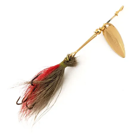 Ant auksinio gluosnio lapo formos lapelio aiškiai išspaustas ikoniškas Hildebrandt pavadinimas, identifikuojantis šią tikslią 1,2 g (3/64 oz) ultralengvą sukriukę. Vielinis rėmelis yra blizgus ir tiesus, su mažu auksiniu karoliuku, kuris tarnauja kaip sklandus lapelio laikiklio guolis. Natūralių rudų ir raudonų plunksnų derinys yra rankomis pririštas aplink trišakį kabliuką, suteikiant subtilų vizualinį profilį, būdingą vintažiniams upėtakių ir ešerių masalams. Šis egzempliorius, pažymėtas prekės kodu 12549, parodo aukštus prekės ženklo padengimo ir surinkimo standartus. Auksinė ašies ir komponentų apdaila yra puikiai išsilaikiusi. Masalas nenaudotas, ant kabliukų gėlių nematyti nusidėvėjimo žymių, o metaliniai paviršiai neapsioksidavę.