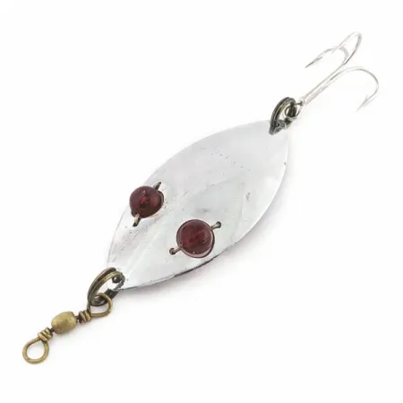 Raudonos stiklinės akys yra išskirtinis šios metalinės vartiklės bruožas, tarnaujantis kaip taikinys plėšrūnėms lėto traukimo metu, kuris dažnai būtinas gaudant lydekas vasaros karštyje. 3" (7,5 cm) ilgio ir 1 oz (25 g) svorio sidabruotas korpusas yra paženklintas Hofschneider pavadinimu ir Rochester, N.Y. adresu. Du raudoni karoliukai įtvirtinti per korpusą, atspindi šviesą ir imituoja sužeistą žuvelę ryškiame sidabriniame fone. Kitoje pusėje nurodytas patento Nr. 1,847,397. Šis konkretus egzempliorius vertinamas 4/5 būkle, pasižymi švariu atspindinčiu paviršiumi ir originalia furnitūra. Vartiklė turi trišakį kabliuką gale ir suktuką priekyje. Produkto kodas 24579.