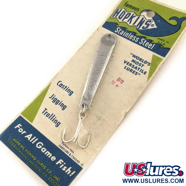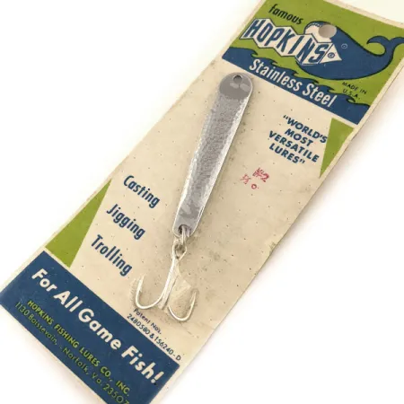 Išskirtinė kalto nikelio apdaila apibūdina šį senovinį Hopkins No=Eql masalą, kurio tekstūruotas nerūdijančio plieno paviršius efektyviai atspindi šviesą. 6,5 cm (2 1/2") ilgio ir 14 g (1/2 oz) svorio 11401 modelis yra pagamintas iš vientiso nerūdijančio plieno, kad laikui bėgant paviršius nepradėtų trupėti ar luptis. Šis konkretus egzempliorius yra nenaudotas ir vis dar pritvirtintas prie originalios „famous HOPKINS“ ekspozicinės kortelės, kurios būklė vertinama 6 balais. Pagamintas Hopkins Fishing Lures Co., Inc. Norfolke, Virdžinijoje, masalas turi alavuotą trišakį kabliuką ir yra pažymėtas patentų numeriais 2480380 bei 156240-D. Pakuotėje nurodomas jo universalumas spiningavimui, džigavimui ir velkiavimui gaudant visas plėšrias žuvis tiek gėlame, tiek sūriame vandenyje. Kitoje kortelės pusėje pateikiamos techninės įžvalgos efektyviam naudojimui, rekomenduojant įvairų traukimo greitį ir specifinį gylį džigaujant prie konstrukcijų, pavyzdžiui, tiltų ar prieplaukų.