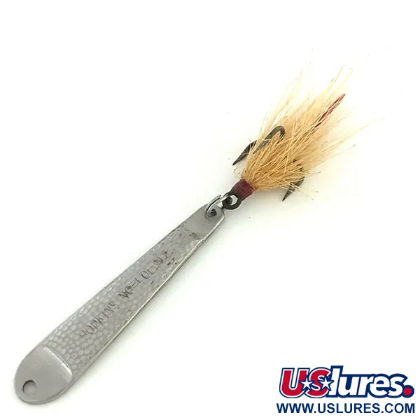 Kalto nikelio tekstūra išskiria šio tvirto metalinio džigo korpusą – tai dizaino sprendimas, skirtas imituoti natūralių masalinių žuvelių atspindinčius žvynus. 14 g (1/2 oz) svorio ir 6,5 cm (2 1/2") ilgio Hopkins No=Eql 2 modelis turi produkto kodą 9341 ir yra klasikinio amerikietiško žvejybos įrankių dizaino pavyzdys. Masalo priekinėje dalyje aiškiai įspaustas gamintojo ir modelio pavadinimas, o galinėje dalyje yra trišakis kabliukas, papuoštas natūraliu rudu elnio kailiu (bucktail), pritvirtintu raudonu siūlu. Šis konkretus egzempliorius yra 5/5 būklės, su švariais paviršiais ir nepažeistomis detalėmis. Dažniausiai naudojama vertikaliam džigavimui arba tolimiems metimams, ši vartiklė dėl savo tankios masės greitai pasiekia gylį tiek gėluose, tiek sūriuose vandenyse.