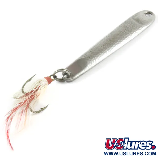 Aiškiai iškalta kaltame metaliniame korpuse, „HOPKINS NO=EQL @ 3“ žyma yra šios 35 g (1 1/4 oz) blizgės skiriamasis ženklas. Hammered Nickel apdaila suteikia išskirtinę tekstūrą 9 cm (3 1/2") paviršiui, atspindėdama šviesą įvairiomis kryptimis. Šis JAV pagamintas masalas, kurio produkto kodas 3285, komplektuojamas su dresiruotu trišakiu kabliuku, turinčiu baltų ir raudonų pluoštų vizualiam kontrastui. Metalas išlieka ryškus ir puikiai išlaikytas, būklė vertinama 5/5. Tiksliai išgręžta kilputė užtikrina tvirtą jungtį sunkiai žvejybai jūroje arba giliuose gėluose vandenyse.