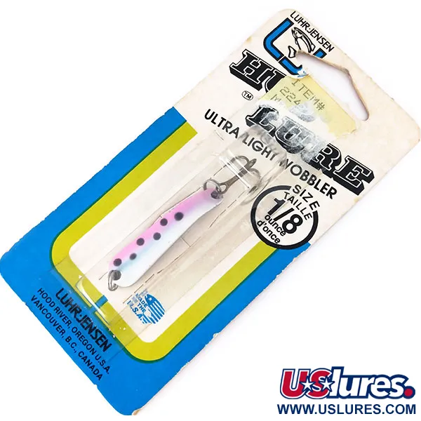 Nikliavimas suteikia atspindintį pagrindą šiai 4g (1/8oz) metalinei vartiklei, skirtai pramušti paviršines sroves ir pasiekti giliau tūnančias žuvis. Ši Hus-lure, žymima prekės kodu 10383, pasižymi Upėtakio raštu su subtiliu rausvai violetiniu atspalviu ir ryškiais juodais taškeliais ant sidabrinio korpuso. 4cm (1 1/2") korpusas suformuotas tolimiems metimams, o siauras profilis leidžia puikiai valdyti masalą tiek upėse, tiek stovinčiame vandenyje. Šis egzempliorius yra nenaudotas, išsaugotas originalioje mėlynai geltonoje kartoninėje pakuotėje iš Luhr Jensen gamyklos Hood River, Oregone. Masalas sukomplektuotas su originalia gamykline furnitūra, įskaitant mažą žiedelį ir aštrų bronzuotą trišakį kabliuką. Kiekviena detalė – nuo aiškaus štampuoto prekės ženklo iki nepažeistos pakuotės – atspindi to meto JAV gamybos žūklės įrankių kokybę.