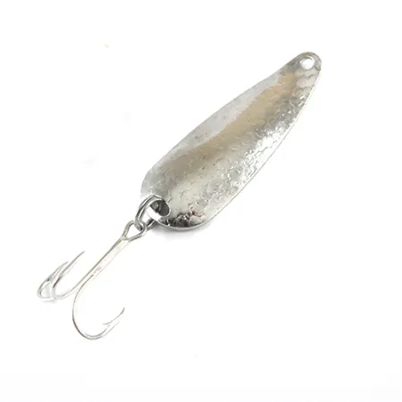 Vidinėje įgaubtoje pusėje aiškiai iškaltas prekės ženklas „JEEP“ – ši metalinė blizgė yra klasikinis vidurio amžiaus JAV žūklės įrankių pavyzdys. 11 g (2/5 oz) svorio ir 5,5 cm (2 1/4") ilgio masalas pasižymi išskirtine kalto nikelio apdaila išorinėje išgaubtoje pusėje, užtikrinančia briaunuotą atspindį. Vidinė pusė yra lygi, joje išryškintas štampuotas logotipas ir JAV gamybos kilmė. Produktas, pažymėtas kodu 1321, yra 5/5 būklės, o padengimas išlieka ryškus ir atspindintis šviesą abiejose pusėse. Standartinis trišakis kablys prie uodegos pritvirtintas per žiedelį, demonstruojant paprastą ir veiksmingą konstrukciją, būdingą šioms ankstyvosioms blizgėms.