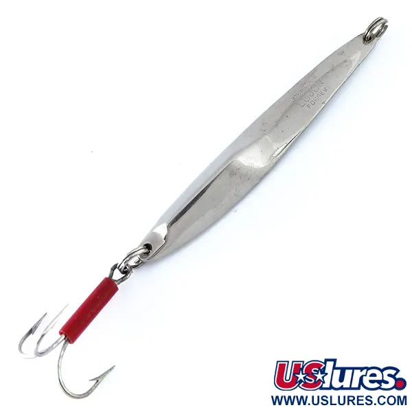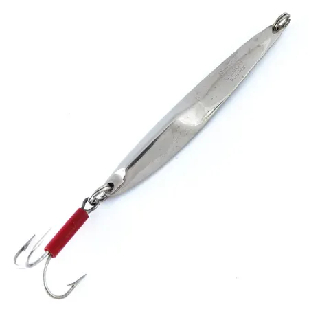 Ant nikeliuoto metalo aiškiai įspaustas „JOHNSON LUJON 1“ identifikatorius, žymintis šį masalą kaip autentišką Amerikos žūklės istorijos dalį. 31 g (1 oz) svorio, sunkus ir grakštus masalo kūnas sukurtas specialiai vertikaliam džigavimui giliame vandenyje arba tolimiems metimams prieš vėją. 9 cm (3 1/2") profilis pasižymi unikaliu asimetriniu metalo išlinkimu – tai dizaino bruožas, skirtas atspindėti šviesą keliais kampais. Šis egzempliorius yra tvarkingos 4/5 būklės, demonstruojantis aukštos kokybės nikelio apdailą, kuria garsėjo „Johnson“ gamybos metais JAV. Pastebima detalė – ryškiai raudonas kembrikas ant trišakio kabliuko kotelio, kuris tarnauja kaip klasikinė vizualinė atakos vieta plėšrūnams. Masalas turi tvirtus žiedelius tiek galvoje, tiek uodegoje, o šis gaminys (kodas 11094) atspindi patvarią vidurio amžiaus džigavimo įrankių konstrukciją.