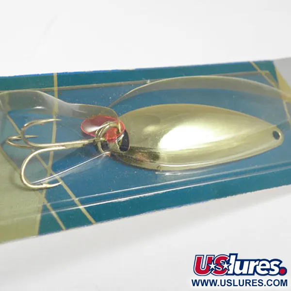 Šios vintažinės vartiklės paauksavimas išliko nepakitęs originalioje gamyklinėje pakuotėje, išsaugant spindintį praėjusios gamybos eros blizgesį. Ši 14 g (1/2 oz) sverianti Johnson Sprite turi originalų „Made in U.S.A.“ ženklą iš Amsterdamo, Misūrio, nurodantį, kad tai yra šalyje pagamintas gaminys prieš prekės ženklo gamybai persikeliant į užsienį. Masalo kūno ilgis yra 6 cm (2 1/4"), o kataloge jis žymimas produkto kodu 0957. Kadangi masalas liko originalioje pakuotėje, jis yra nenaudotas ir puikios būklės (būklė: 6). Šis egzempliorius pasižymi klasikinio lašo formos profiliu ir auksu dengtu trišakiu kabliuku, būdingu aukštos kokybės furnitūrai, kuria Johnson garsėjo savo gamybos JAV metais.